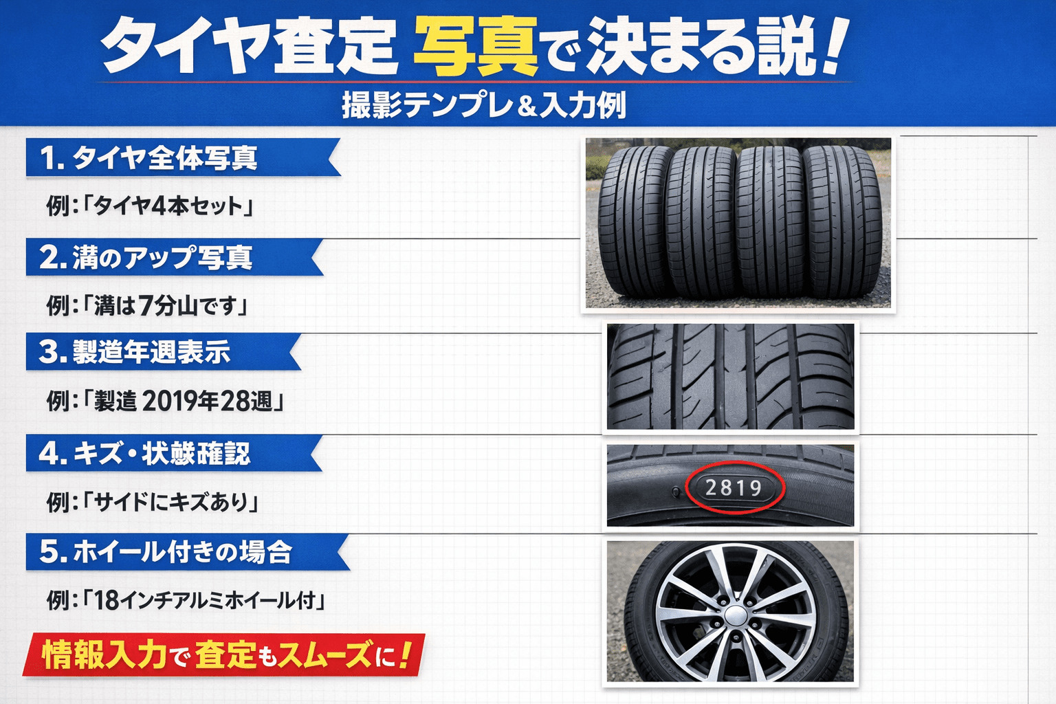 最低限、全体・溝・サイド・刻印(サイズ/製造年週)を揃えるだけでOK。